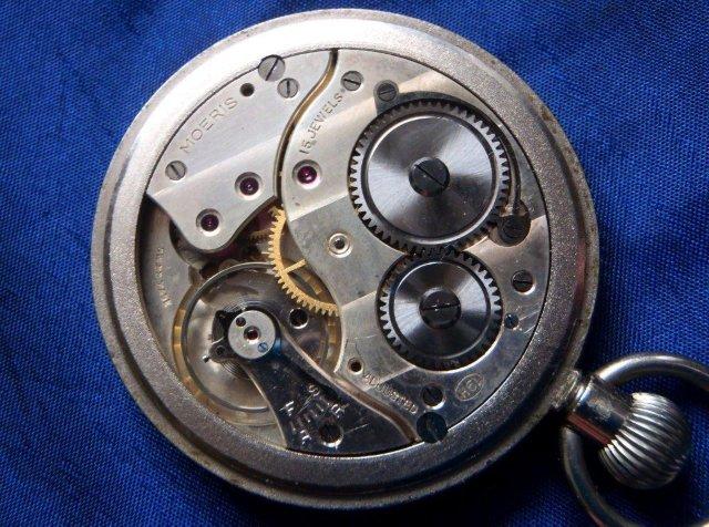 spárované ručičky sú typu military s luminisc. náterom , tiež niektoré číslice svetielkovali na cifrníku zn. MOERIS. / Fabriqwue des Moeri