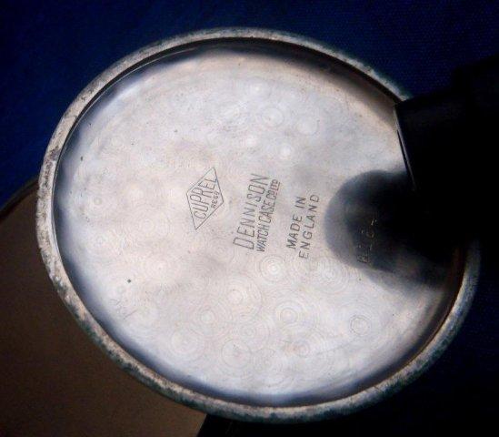vnútorná strana sign CUPREL DENNISON WATCH CASE Co. Ltd a MADE IN ENGLAND. Prachové viečko značené totožne. Sedem rubínový kaliber