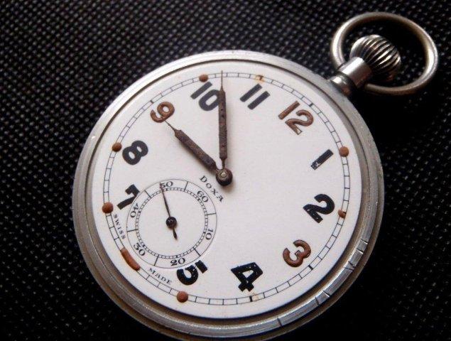 Popis: DOXA britské /swiss/ pánske military hodinky z WW II. z obecného kovu zn. DOXA na metalizovanom ciferníku, ručičky