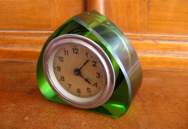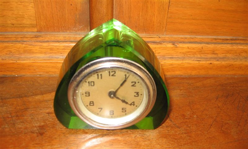 /výška 80 mm. / Ide o plne funkčný kus ART DECO štýl hodinky osadené v hrubom neporušenom zelenom skle.