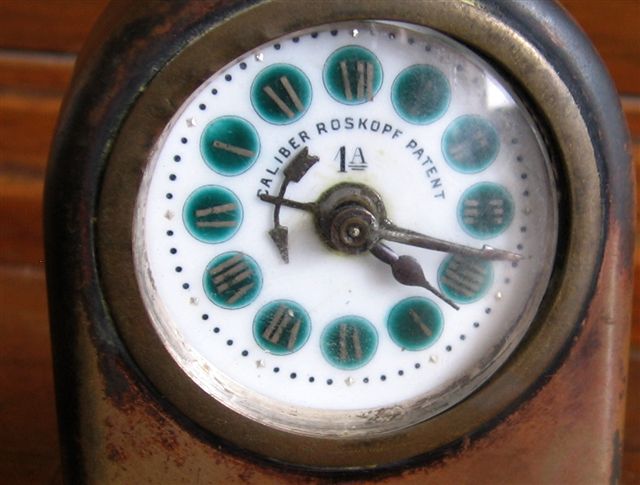 Popis: Wecker ešte v medenom plášti značený na ciferníku: CALIBER ROSKOPF PATENT A1, rozmer budička cca 6 x 8 cm.