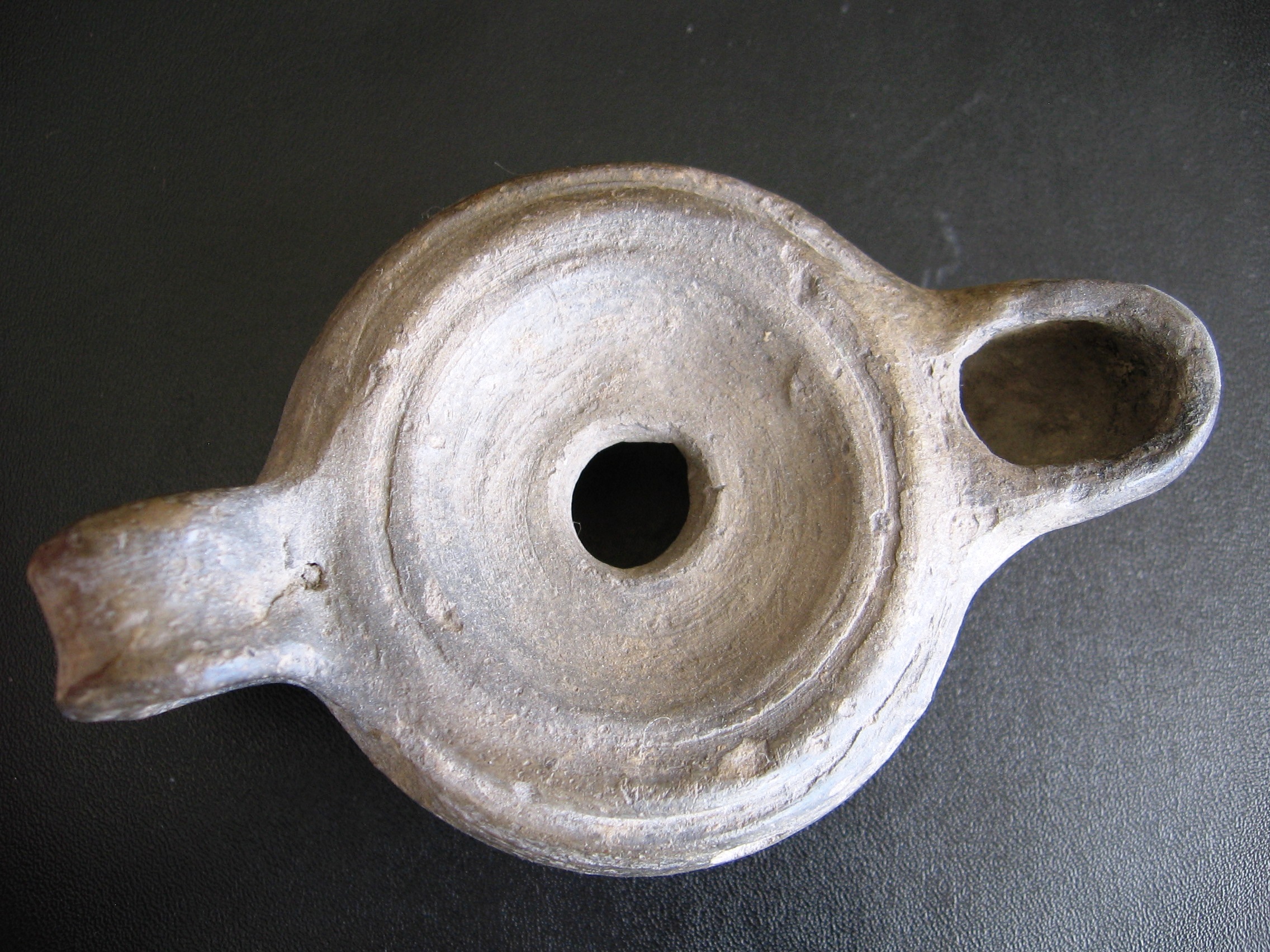 Popis: antický kahan , prvé až tretie storočie n. p. bez kolku / bez značenia na spodku/ Vzácny nález s dvoma otvormi