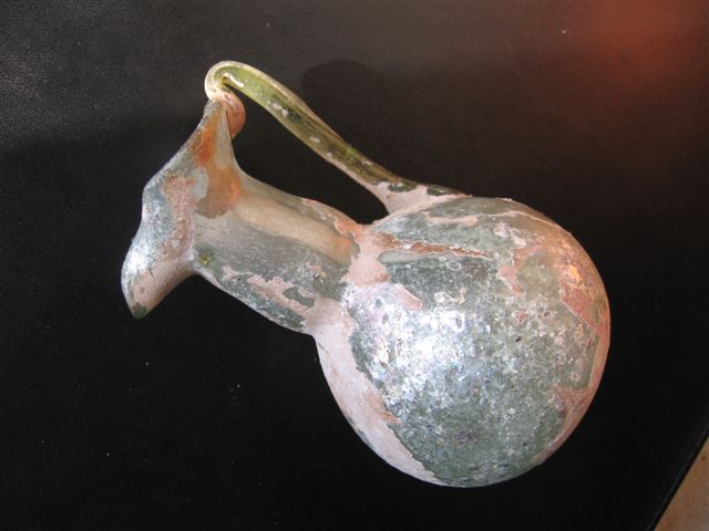 Popis: Rímske sklo unguentarium,džbán s uchom výška 10.5 cm /väčšie ucho nad hrdlo/