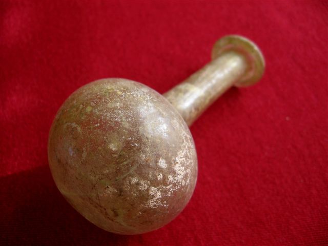 Popis: Rímske sklo unguentarium, výška 10,5 cm šírka v dolnej časti 5.5 cm I.až IV. storočie nášho letopočtu.